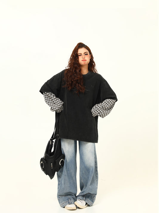 チェック柄 フェイクツーピース スウェットシャツ P1781