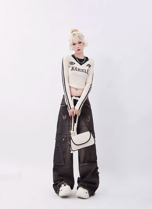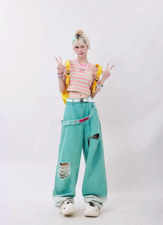 Retro Ripped Design Loose Straight Pants P961