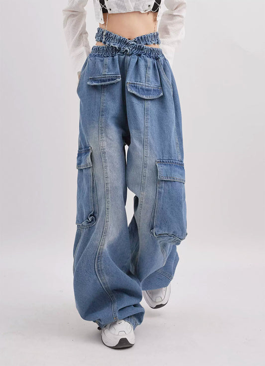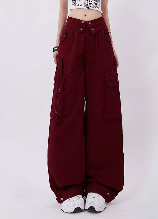 Folded waistband multi-pocket loose pants P957
