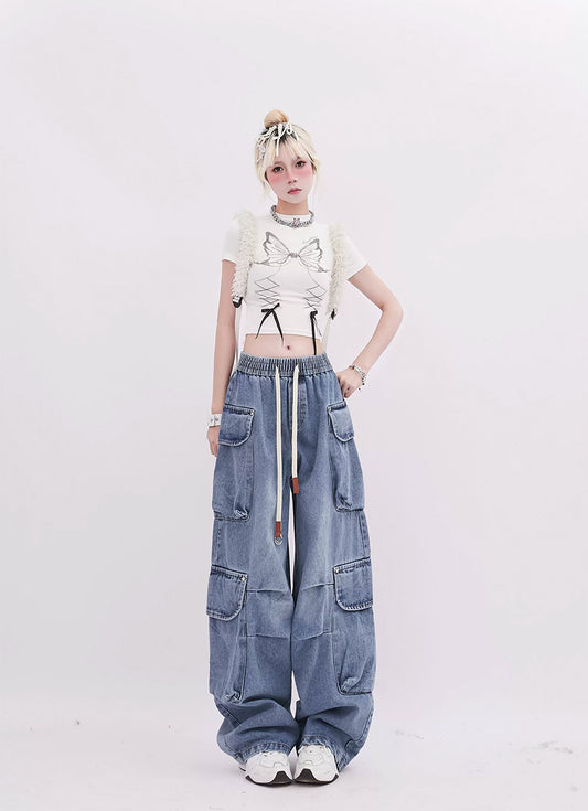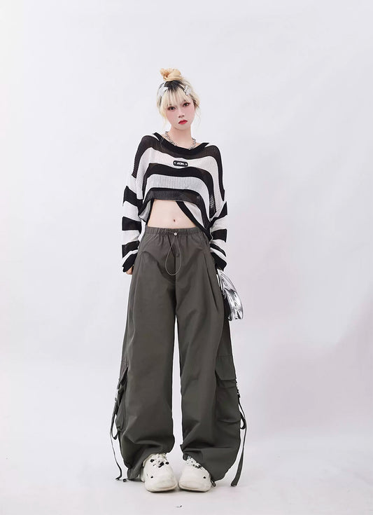 Big pocket drawstring design straight pants P966