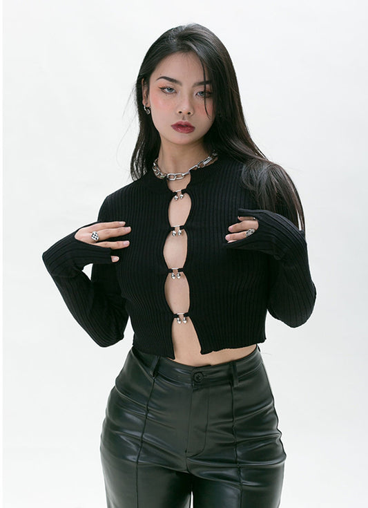Hollow metal button short sleeve sweater P756